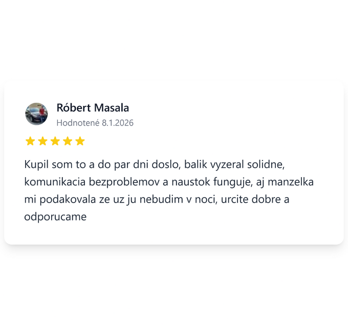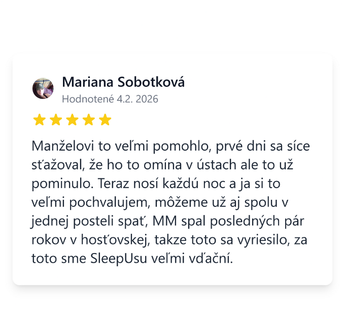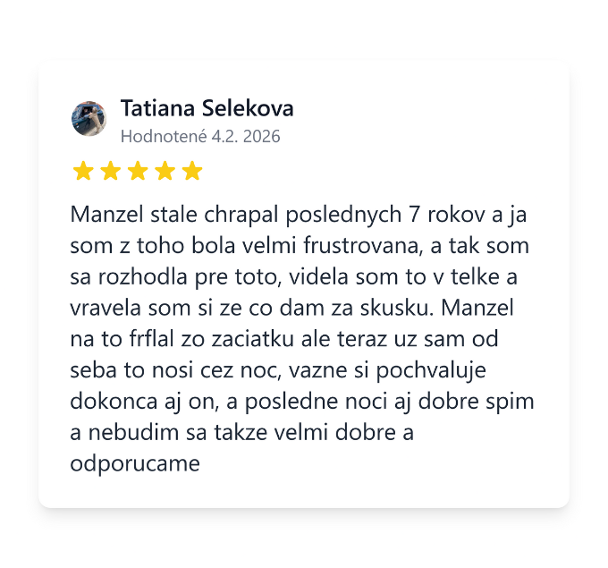 Dva roky som spala v detskej izbe na gauči. Dcéra sa pýtala, prečo mama nespí s ockom. Čo jej na to poviete? Vedela som, že nás to odďaľuje — neboli sme pár, boli sme spolubývajúci. Manžel chrápal celý život, ale posledné roky to bolo neznesiteľné, steny sa doslova triasli. Pásiky na nos, vankúš pod hlavu vyššie, ležať na boku — skúšali sme všetko. Nič. O SleepUs som sa dozvedela od kolegyne z práce, ktorej muž mal rovnaký problém. Bola som skeptická, pretože sme už vyhodili peniaze za tri rôzne veci, čo nefungovali. Ale povedala som si — ešte poslednýkrát. Prvý týždeň si zvykal, ale už druhý týždeň som sa vrátila do našej spálne. Zaspať vedľa neho v tichu — po dvoch rokoch — to bol jeden z najkrajších pocitov v mojom živote. Nie som romantická, ale toto mi vrátilo kus manželstva.