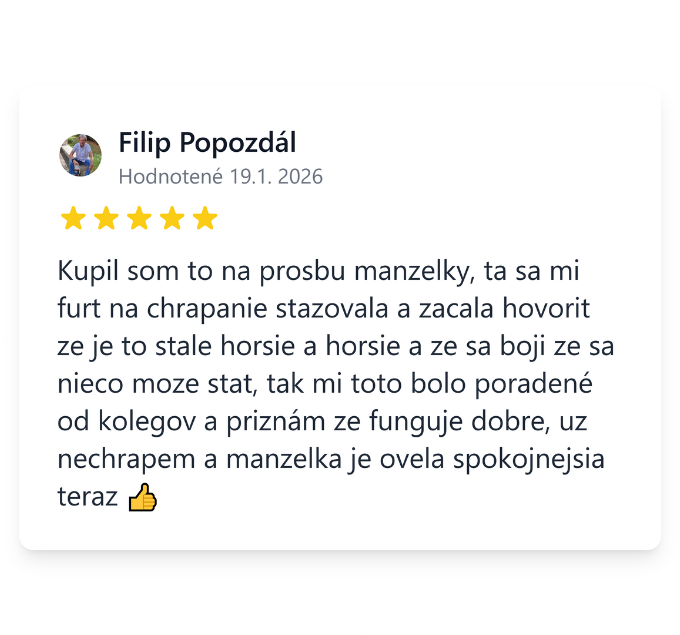 Manžel chrápe 20 rokov. Dvadsať. Zvykla som si, hovorila som si. Ale pravda je, že som si nezvykla — len som sa prestala sťažovať. Ráno som bola unavená, cez deň som zaspávala pri telke, v piatok večer som nemala energiu na nič. Myslela som si, že to je vek. Keď som mu dala SleepUp, prvú noc som sa zobudila o piatej ráno a v izbe bolo ticho. Také ticho, aké som v našej spálni nepočula roky. Pozrela som sa na neho — spal pokojne na boku, ústa zatvorené, ani zvuk. Zostala som chvíľu ležať a len som počúvala to ticho. To ráno som si uvarila jednu kávu namiesto troch a cítila som sa ako iný človek. Teraz viem, že to nebol vek. Bolo to 20 rokov bez poriadneho spánku.